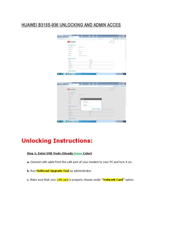 The step by step instructions to unlock huawei b315s 22 router is given as below. Please note that when you enter the code, make sure that you are entering a valid code and it is not a free code available randomly on the internet. Dec 20, 2016 · comment at isang subscribe lng bilang pasaslamat!! Jul 17, 2021 · best fast way huawei b315s 936. Please subscribe my channel a. Run multicast upgrade tool as administrator. Make sure that your lan card is properly chosen under "network card" option. How to unlock huawei b315s 22 router with network unlock code. Feb 25, 2019 · to unlock your b315 router ( huawei b315s lte) no need to open screws, not required to soldering, lan cable is enough, no usb cable need. Connect lan cable from the lan port of your modem to your pc and turn it on. 1.make sure your huawei b315s wifi router device charged 40 % atleast (or) connected to pc via usb cable Step by step instructions free. Included is our 24/7 customer support!